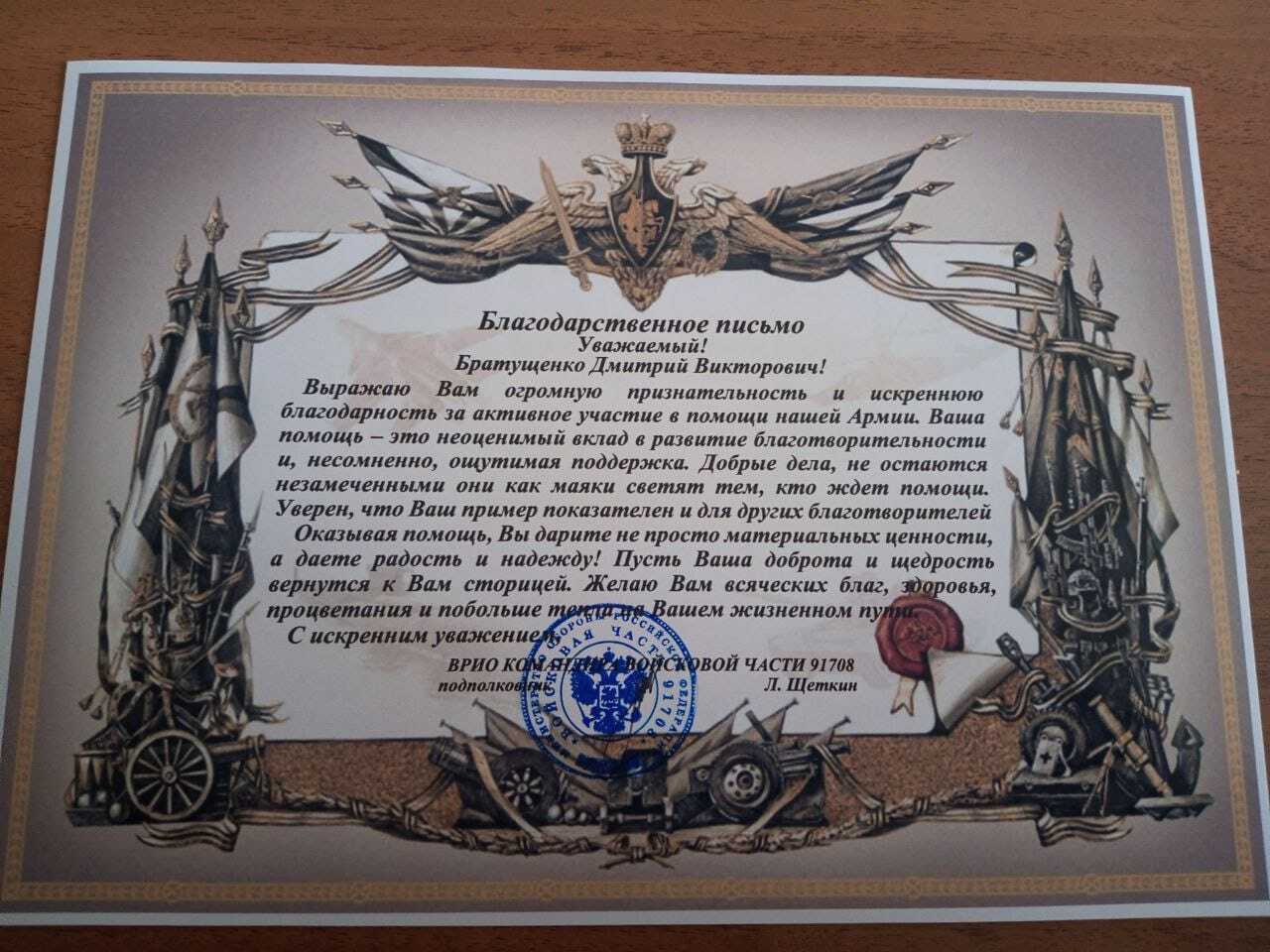 Благодарность руководителю ЦОБР